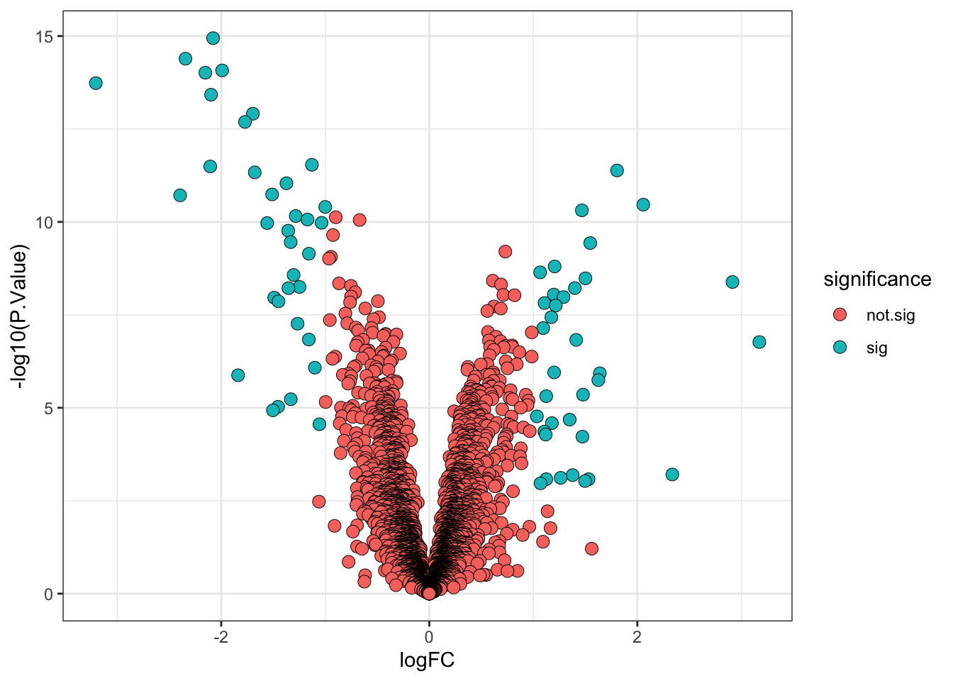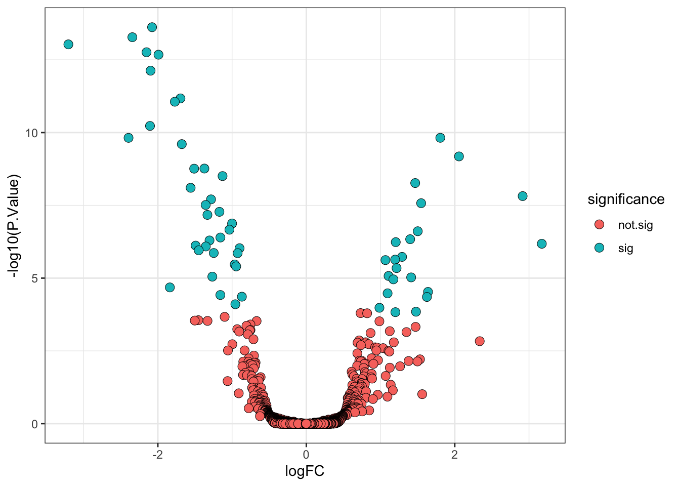 significance = ifelse(adj.P.Val < 0.01, "sig", "not.sig"))Finally, we visualise the volcano plot.
