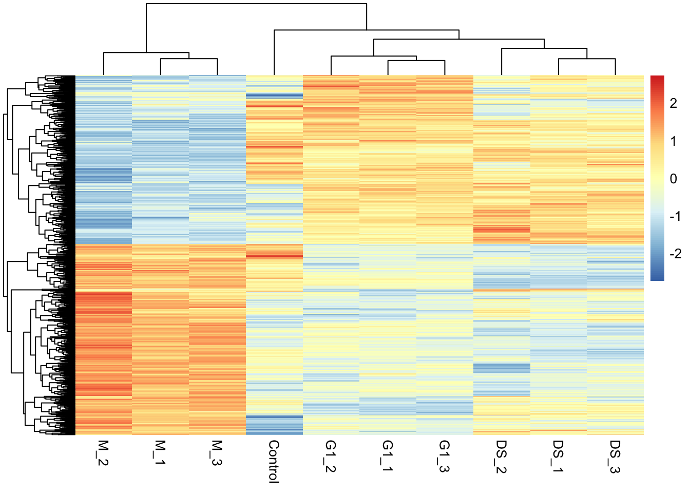 - The samples are independent not paired. For example, M_1 is not derived from the same cells as G1_1 and DS_1.