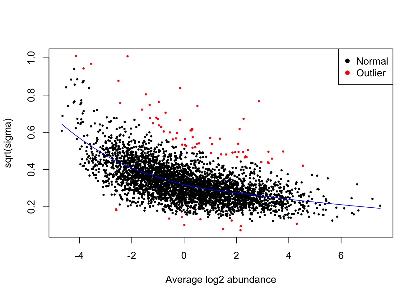 It is recommended that an SA plot be used as a routine diagnostic plot when applying a limma-trend pipeline. From the SA plot we can visualise the intensity-dependent trend that has been incorporated into our linear model. It is important to verify that the trend line fits the data well. If we had not included the trend = TRUE argument in our eBayes function, then we would instead see a straight horizontal line that does not follow the trend of the data. Further, the plot also colours any outliers in red. These are the outliers that are only detected and excluded when using the robust = TRUE argument.
