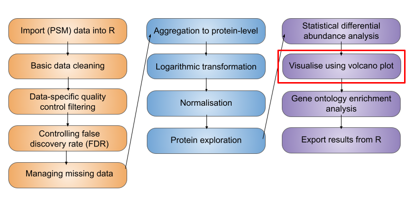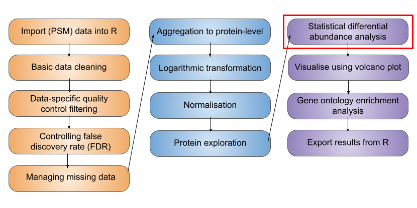 Having cleaned our data, aggregated from PSM to protein level, completed a log2 transformation and normalised the data, we are now ready to carry out statistical analysis.