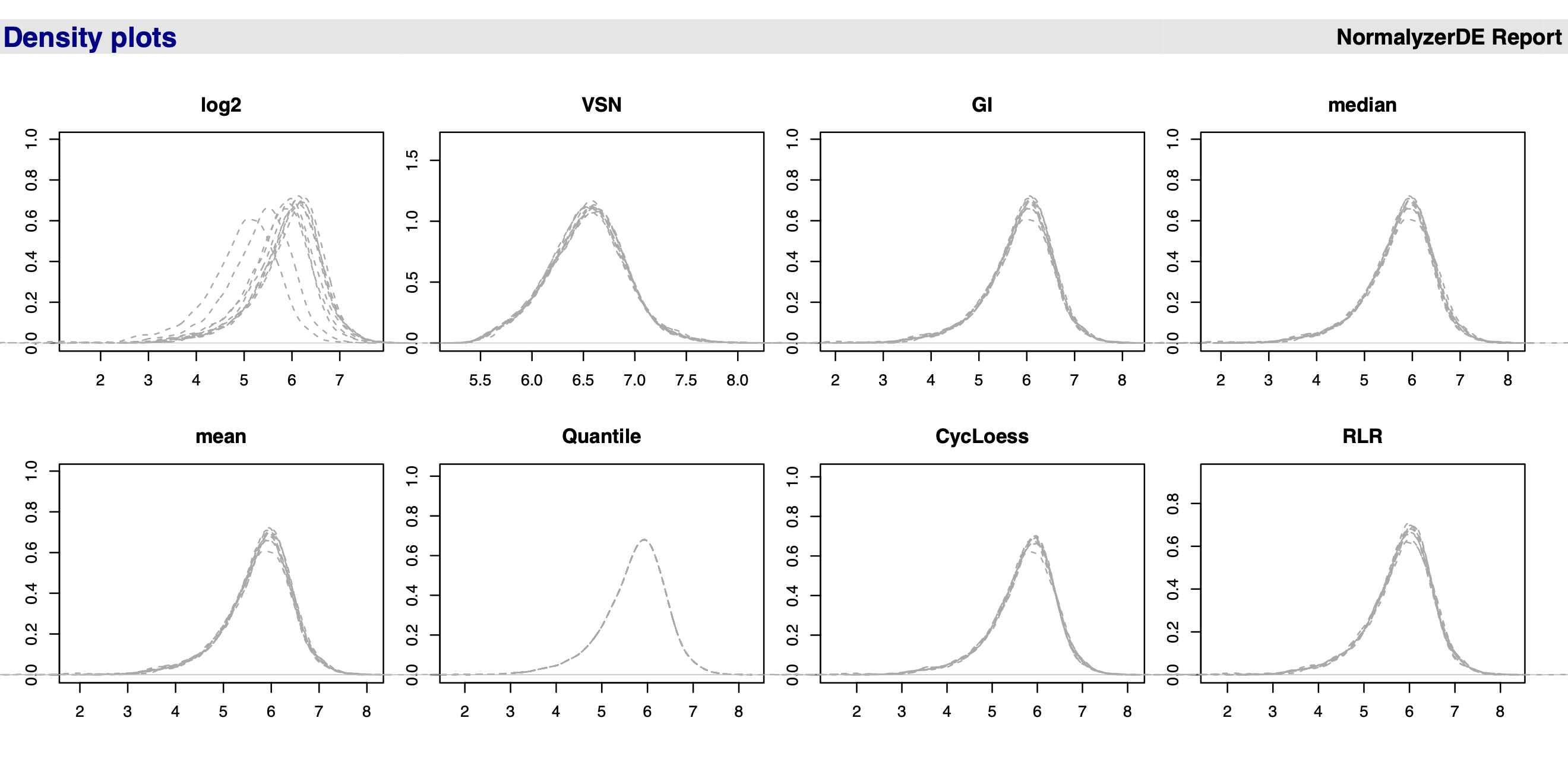Figure 9.1 shows a screenshot of the PDF report output from running the normalyzer pipeline. We see that the data before normalisation (log2, topleft) has curves/peaks at different locations and what we want to do is try and register the curves at the same location.