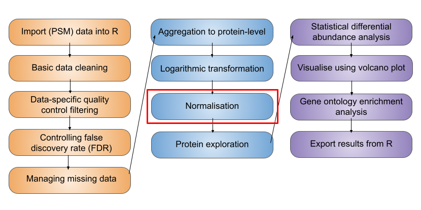This workflow is an adjunct to the Normalisation and aggregation section which demonstrates how to normalise proteomics data using the normalize function within the QFeatures infrastructure. Please first read through that material, since it includes background explanations and discussions which are not repeated here.