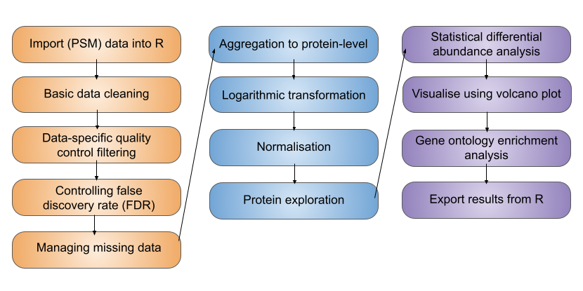 - Understand how experimental design influences data structure and the required processing steps. In particular, how the analysis of label-free data could differ from that of the TMT use-case data.